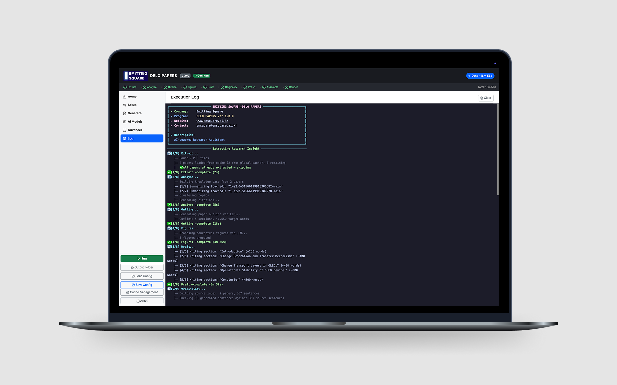 DELO Papers v1.0 is available today on Windows, with macOS support arriving in May 2026. The application requires an internet connection for LLM-based processing and is delivered as an installation package with a hardware-locked license. Trial version is freely available. To get started, contact the EMITTING SQUARE team at emsquare@emsquare.ai.kr.