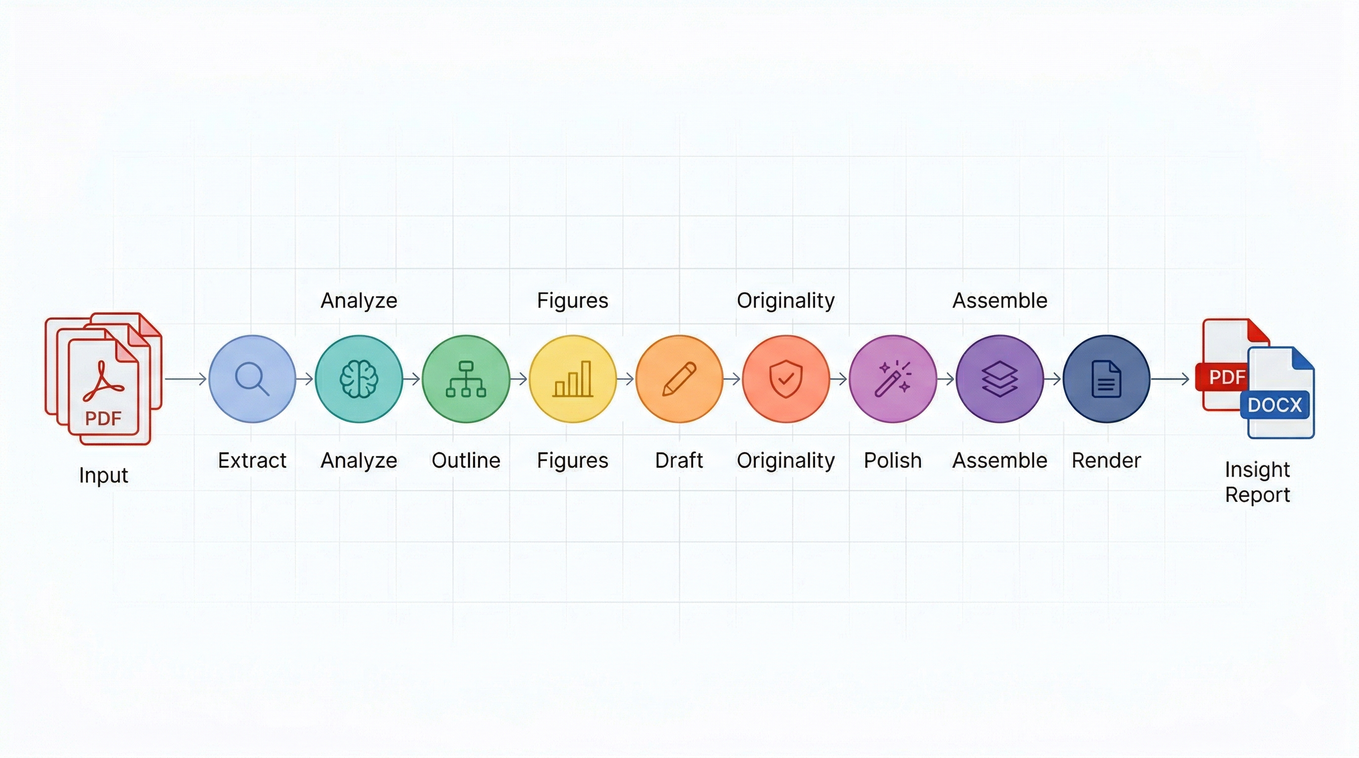 DELO Papers runs a nine-stage automated process that follows the same workflow an experienced researcher would, but compresses months of effort into minutes. Each stage runs sequentially to ensure coherence, accuracy, and originality.